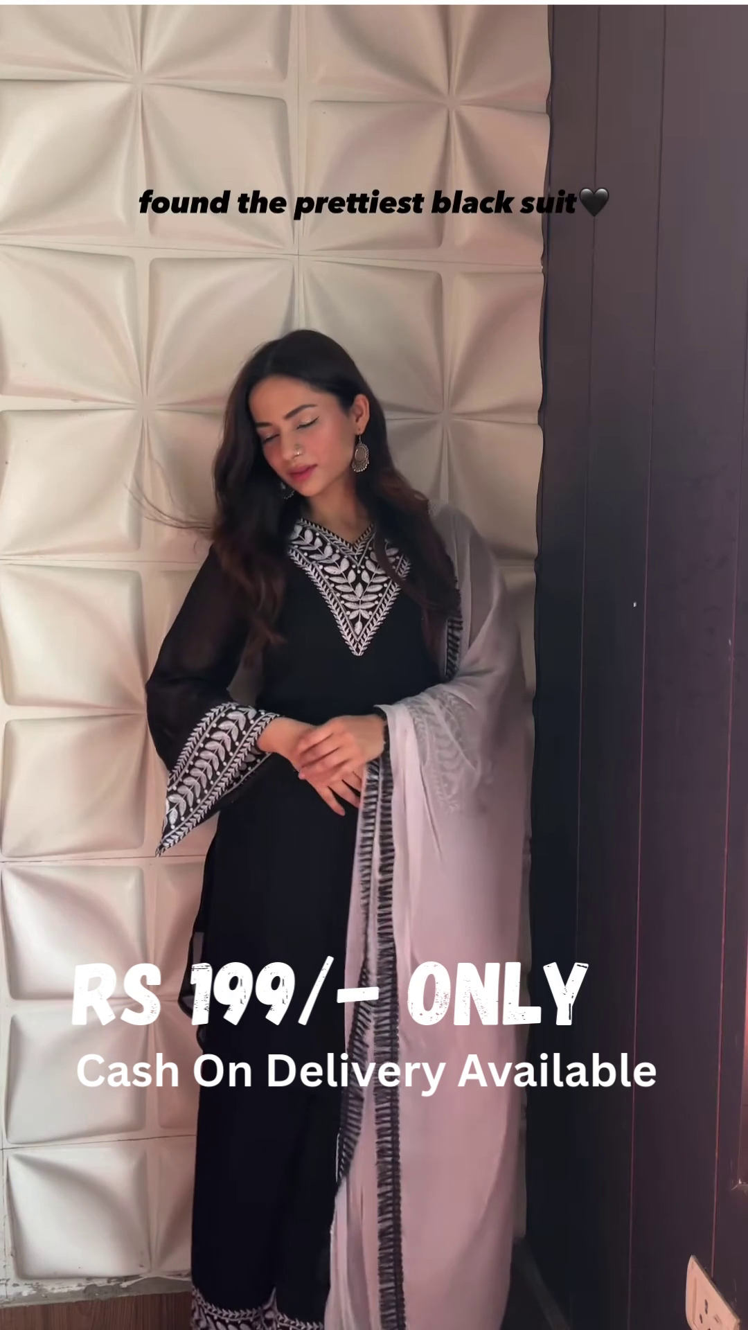 • Classic black ensemble with intricate white embroidery