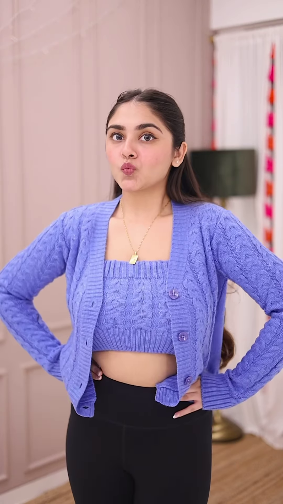 - π§Ά Cable-Knit Co-Ord: Matching blue cardigan and crop top with button detailing; paired with black high-waisted pants