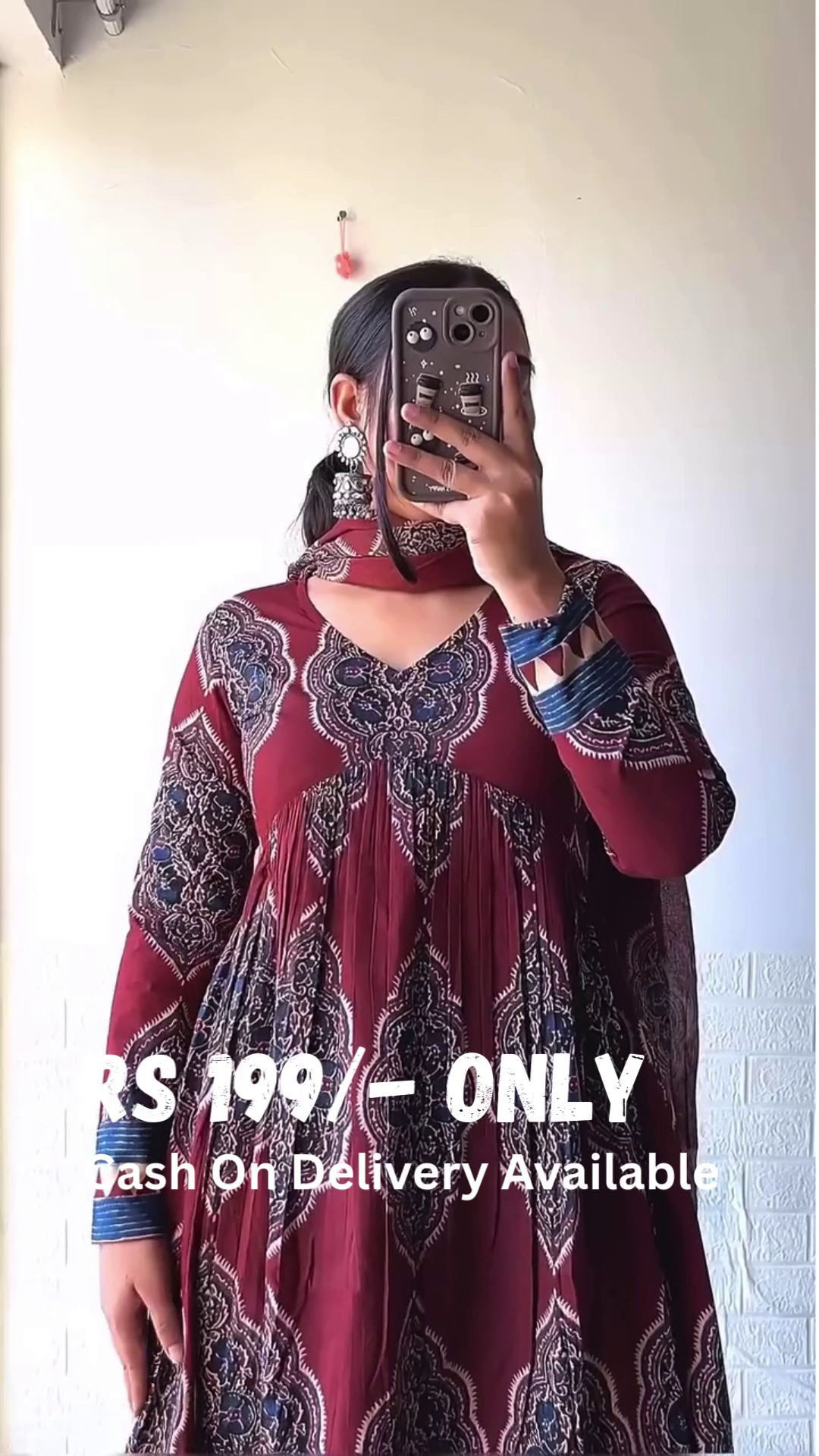 Design & Craftsmanship: This beautifully flared Anarkali set features an intricate traditional print in deep maroon, enhanced with striking blue and beige accents. The pleated yoke design adds a flowy elegance, while the unique sleeve cuffs offer a touch of contrast for a refined appeal. The V-neckline elevates the overall look with a graceful touch.