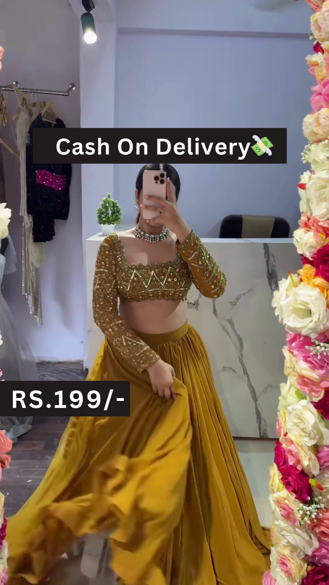 Make a confident statement with this Golden and Mustard Lehenga Choli Set, curated for the young and stylish spirit who adores ethnic simplicity with shimmer. Captured in a floral-framed mirror selfie, this look embodies feel-good fashionideal for haldi events, college festivals, casual puja wear, or gifting.