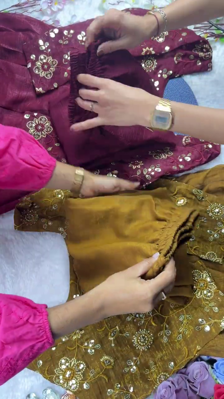 Feature Details Type Premium Designer Mirror-Work Sharara Set Work Type Hand-Set “Kach” (Mirror) Work • Golden Zari Botanical Jaal Colors Deep Wine and Ochre Yellow with Gold Accents Top Style Flared Peplum Kurti with Heavy Floral Embroidery Bottom Style Wide-Leg Sharara with Mirror-Work Borders Fabric High-Shine Metallic Silk-Blend with Soft Lining