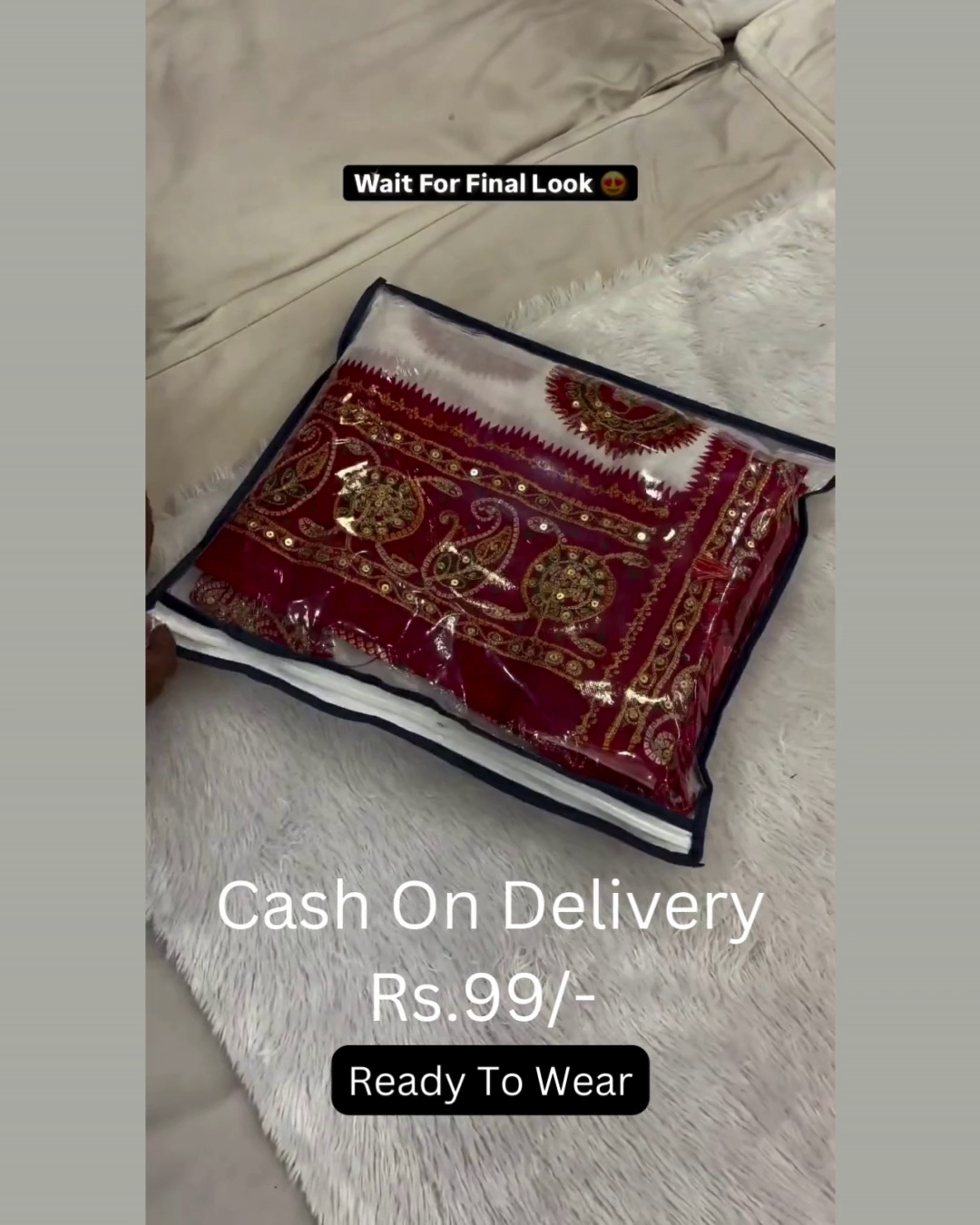 • Ironing: Use a steamer or a very cool iron on the reverse side only; never apply direct high heat to the metallic zari or sequins.