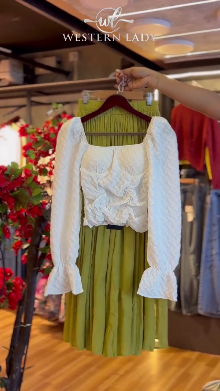 Textured Crop Top in Ivory & Pleated Skirt in Olive