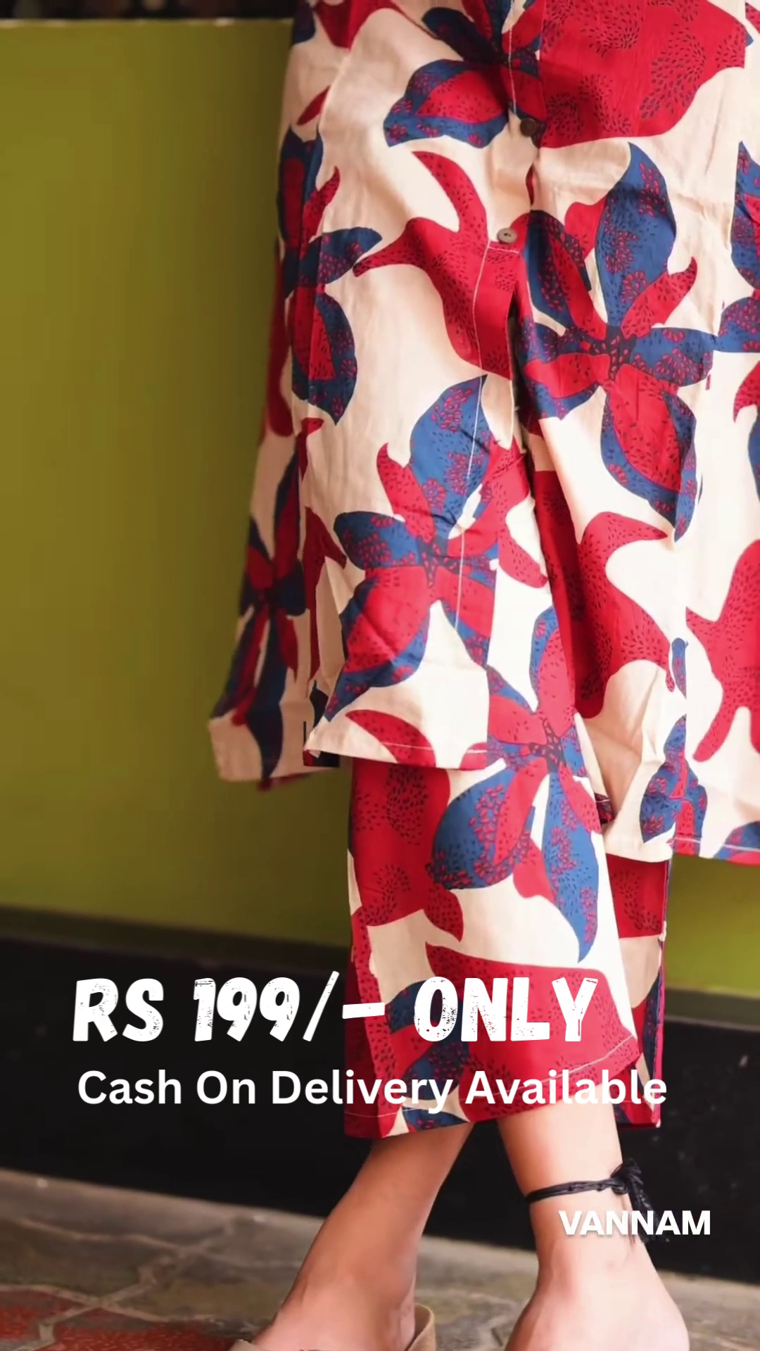 Design & Craftsmanship: Embrace bold elegance with this striking floral kurti set, featuring oversized red and blue floral motifs on a soft off-white base. The classic button-down front and structured A-line silhouette create a flowy yet polished look, perfect for both casual and semi-formal settings.